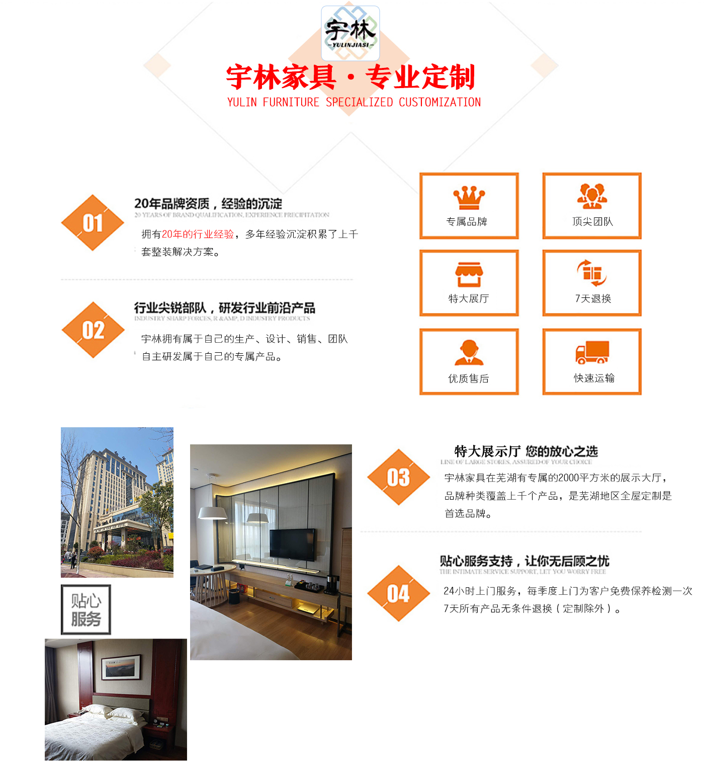 蕪湖宇林工貿(mào)有限公司創(chuàng)建于1996年,位于蕪湖高新技術(shù)開發(fā)區(qū)南區(qū),占地面積13000余平方米。是一個集研發(fā)、設(shè)計為一體的綜合性公司,公司主營整體家居定制、酒店家具定制、娛樂場所配套家具以及軟體系列,團隊,銳意革新、進去不息的理念,逐漸成為蕪湖家具行業(yè)的生產(chǎn)廠家,并在2006年注冊了“宇林”牌商標(biāo)。宇林品牌家具依現(xiàn)代與古典相結(jié)合的多種實木家具、實木貼皮家具。家具做工精細(xì),多用人工雕刻;其自然、典雅的風(fēng)格在很大程度上引導(dǎo)著人...